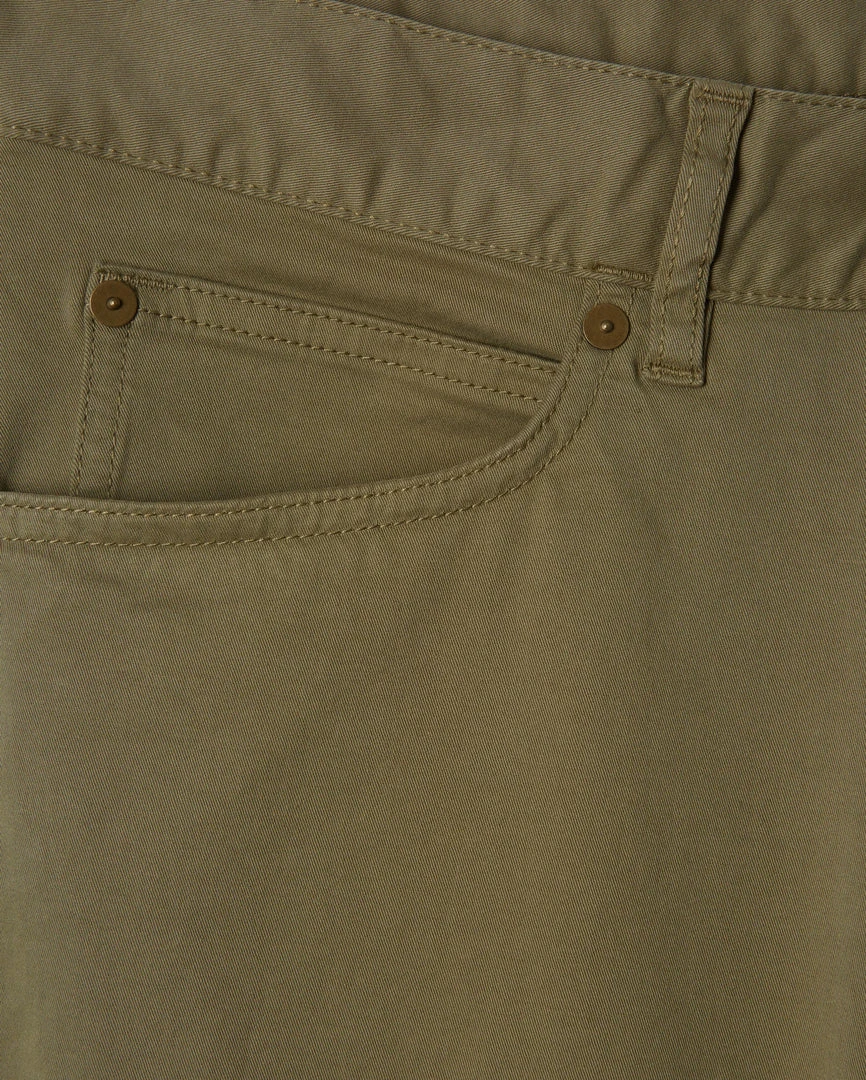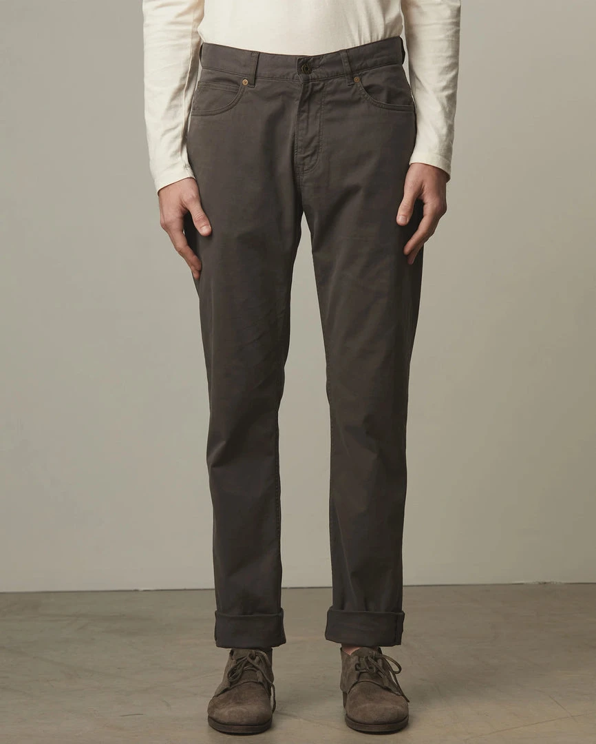 These pants are made in Portugal from cotton with just a hint of stretch, and are garment-dyed for a lived-in look and feel. Finished with unexpectedly luxe details like an antique brass button at the waist, and an embossed leather waistband patch.