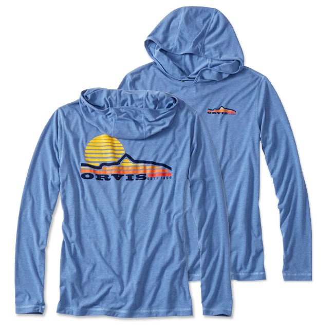 Stay cool and covered in this breezy drirelease hoodie with a colorful mountain sunrise logo on the back. Patented blend of polyester and cotton is naturally moisture wicking and quick drying with no chemical or topical treatments. Dries four times faster than cotton. Soft, natural feel with built-in odor protection. In medium blue. Polyester/cotton. Washable. Imported.