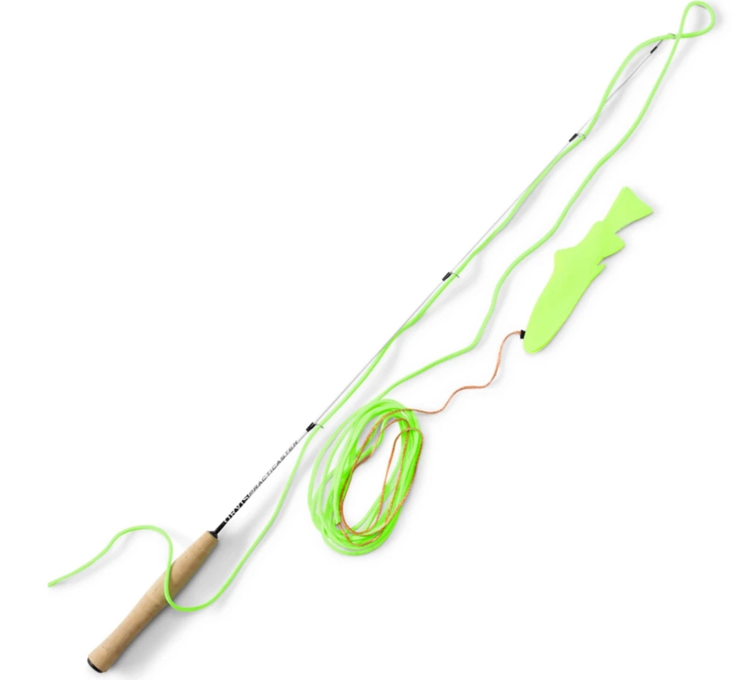 A new and updated PractiCaster fly rod that is shorter and more compact for indoor casting practice anywhere and comes with three hook-and-loop “trout” targets and multiple casting game instructions. PractiCaster perfectly imitates the cast and allows you to develop and improve the exact motion used in a real cast. One-piece rod is 36″ long, in white with black wraps, cork grip, new logo graphic, and green line with orange fly for easy visibility.