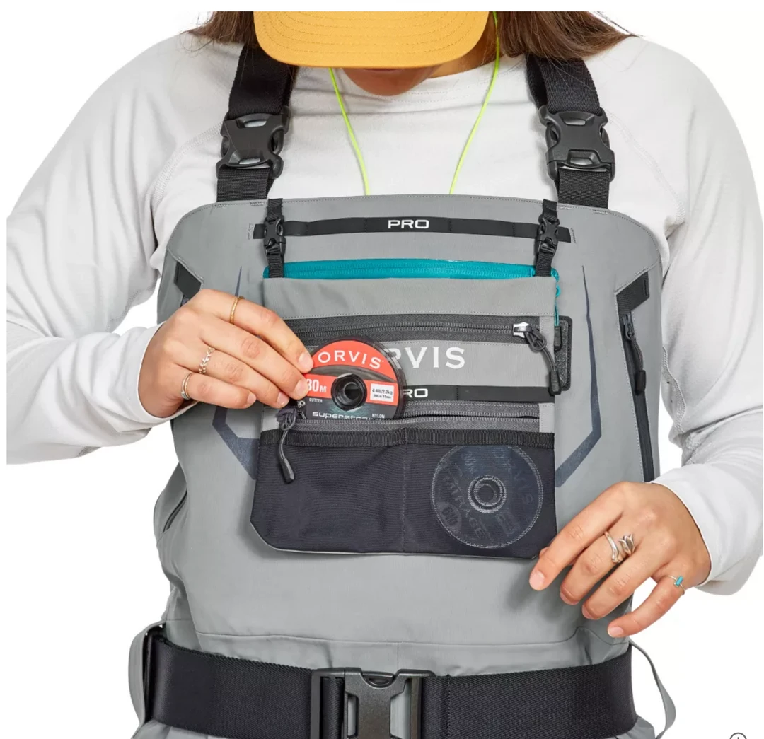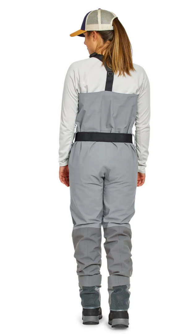 The Orvis PRO women’s fishing wader is built for the professional angler, whether by trade or simply by passion, who will go to whatever extreme necessary to find fish. Built with an athletic fit, the PRO Wader uses an extremely durable proprietary four-layer Cordura® shell in the upper and five-layer Cordura shell in the lower legs for the best-in-class abrasion and puncture resistance. Low profile seam construction and a gusseted crotch enhance movement and seam strength. Modern anatomically correct neoprene booties have less bulk with a true “sock” feel and are more comfortable inside wading boots, while the streamlined PU reinforced mesh gravel guard covers the boot tightly and completely eliminates drag and water collection.Convenience features include an external storage pocket with YKK AquaGuard® water-resistant zipper to keep essentials dry and prevent loss. Rubberized tabs on suspenders and front pocket daisy chain for tool docking, offer multiple locations for essentials and eliminate chance of puncturing waders or losing tools. Fly patch on front pocket for quick changes and drying.Large four-way stretch power mesh interior pocket expands to fit larger items yet stays out of the way when empty. Kangaroo style fleece-lined handwarmer pockets with YKK AquaGuard® water resistant zippers. Removable Ortholite® X25 knee pads use the same technology found in our PRO Boot insole for optimal comfort and rebound. Removable accessory pocket allows for quick access to gear and offers the features of a small pack. Adjustable elastic suspenders with opposing buckles for waist-high conversion. Interior hook-and-loop patch accommodates our Orvis waterproof pocket (8G3H sold separately). Wader weighs approximately 44 oz. in (small regular).